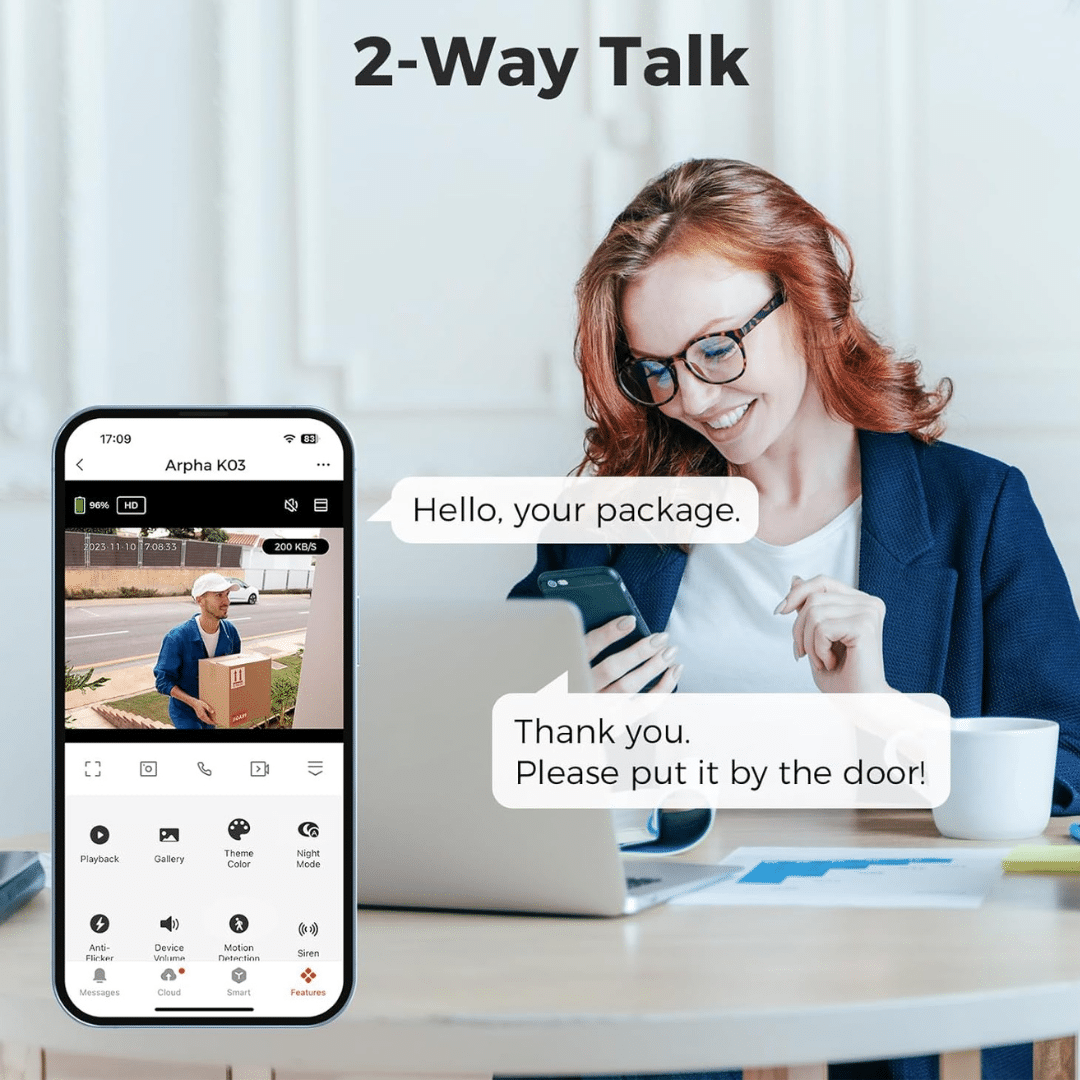 2-Way Talk: La cámara inteligente está construida con micrófonos y altavoces incorporados. Los usuarios pueden comunicarse con los visitantes a través de la aplicación.